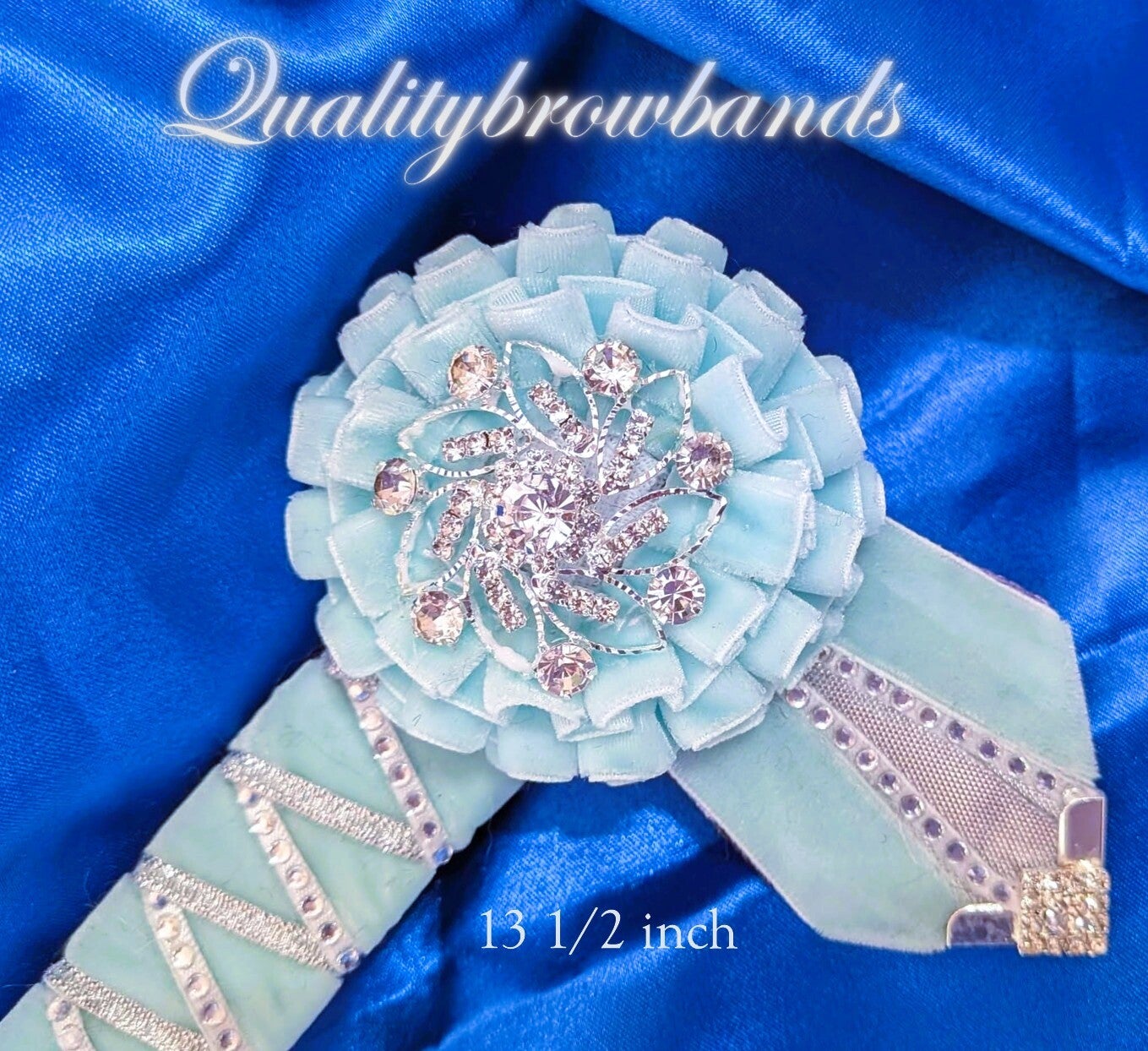13 1/2 inch mint and silver Browband. The browband is ready to buy now. This name highlights the band's core colour scheme and distinctive Sharkstooth pattern, created with a metallic silver border ribbon and white satin border with insert rhinestones. The Rosette has a 3-tier Box Pleat, petite setting, and a large Crystal Sunburst Center.