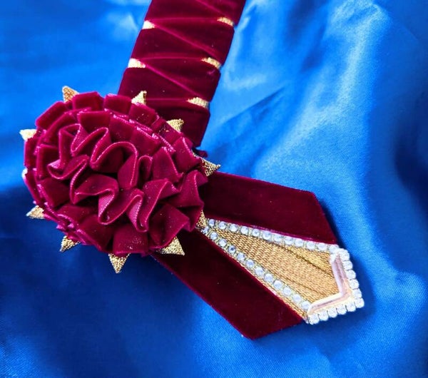 15 1/2-inch x 1/4 " wide band *** A regal classic feel. The deep red wine, Swiss Velvet, and the gold accents under the rosette. The band is simple, direct, and highlights the premium nature of the velvet. The gold flecks give this piece a timeless, heirloom quality.