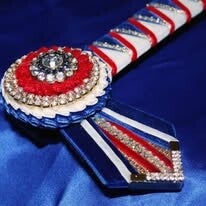 A radiant browband rosette that celebrates unity. Liberty’s Embrace features a bold tricolor palette—crimson red, pure white, and deep navy—layered in crystal gold rings that give harmony. The central rosette sparkles with rhinestone accents, symbolizing clarity and brilliance at the heart of tradition.