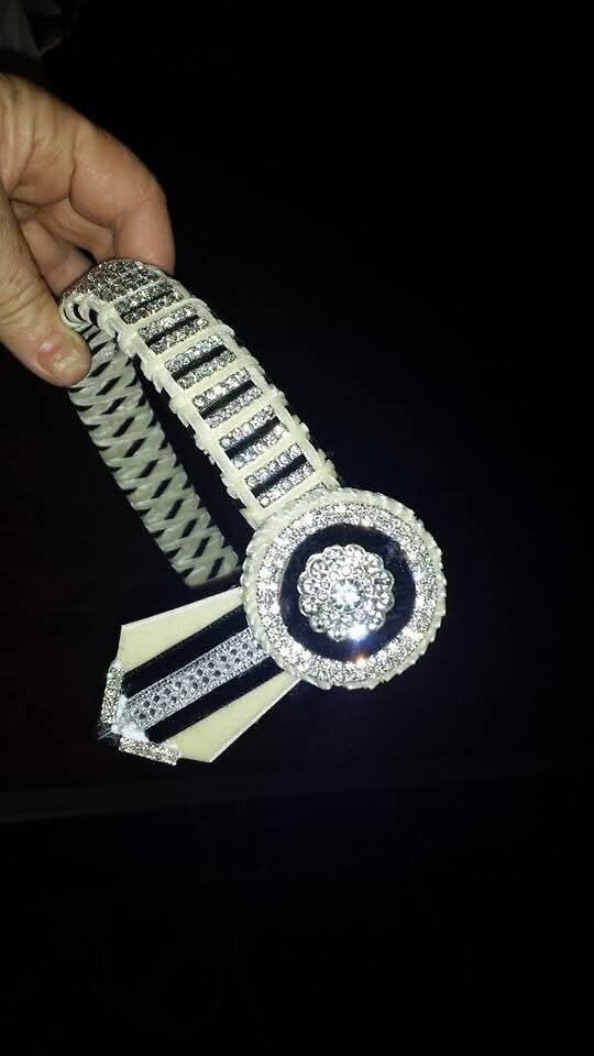 A Cream Swiss velvet is wound around the band. A 3mm Black and a 3mm cream velvet ribbon are used alternatively to weave a six-row silver crystal chain. A 3mm cream ribbon is used to weave a border on each edge of the band. The rosette has cream and Black pleated ribbon with a double silver ring to border the rosette, finishing with a floral crystal center. The flag is bordered with cream and black velvet with a rhinestone ribbon in the center.