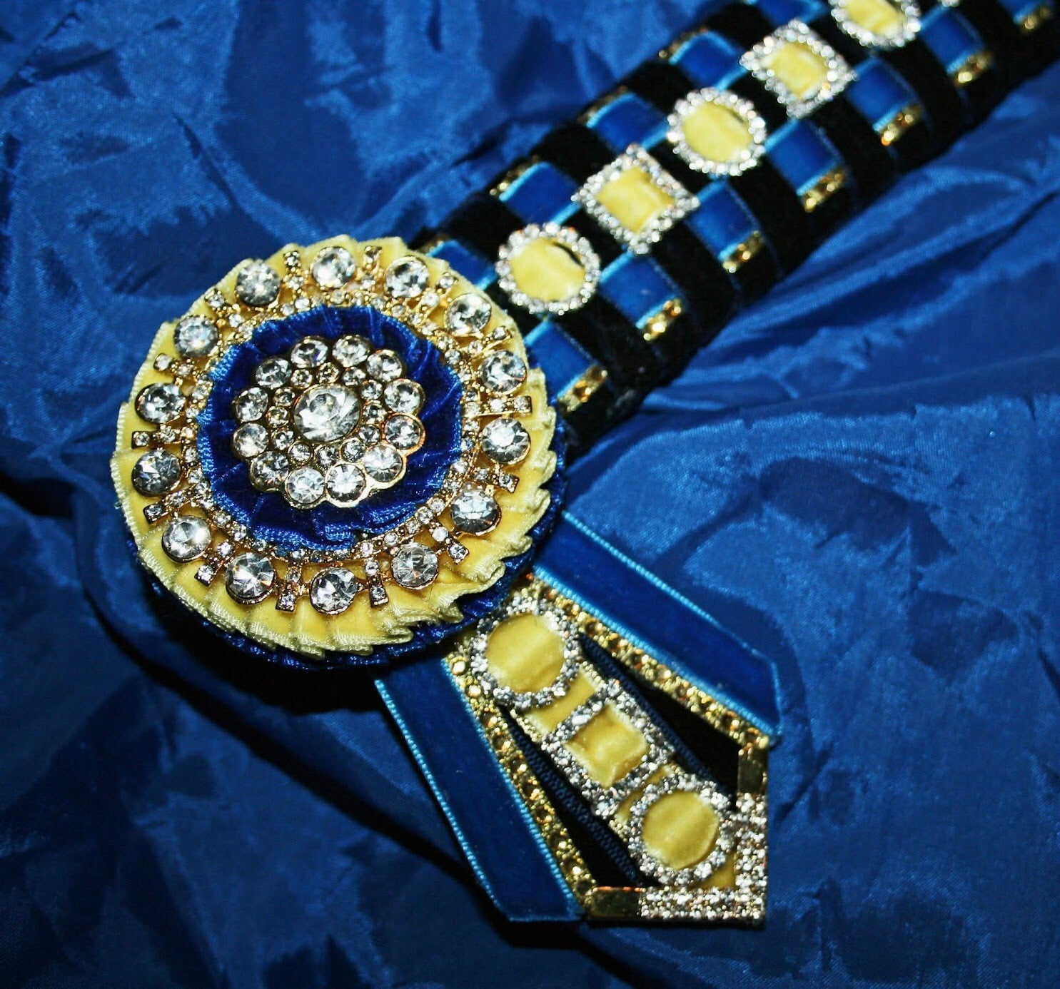 A checker pattern, using black, lemon, and Royal blue velvet ribbon, adding a single gold rhinestone ribbon woven to the edges of the browband. The flag has three rows of velvet pleat ribbon with a decorative gold crystal ring and a crystal floral center.